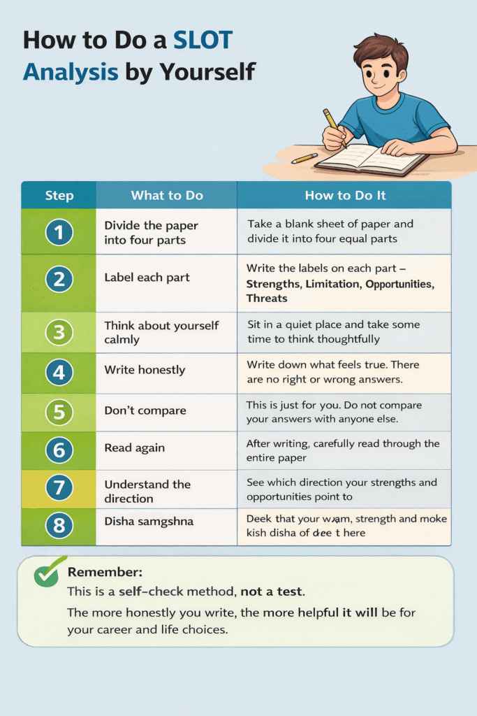 SLOT Analysis क्या है? – युवाओं को यह सिखाता है कि करियर अचानक नहीं चुना जाता। यह एक सोच-समझ की प्रक्रिया है। जब युवा अपने अंदर और बाहर दोनों बातों को समझ लेते हैं, तो वे अपने लिए बेहतर रास्ता चुन पाते हैं।